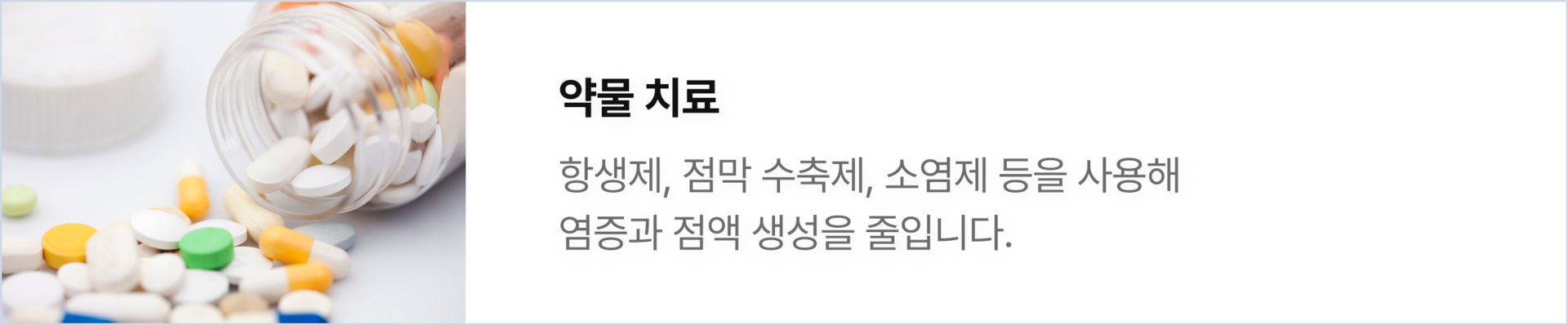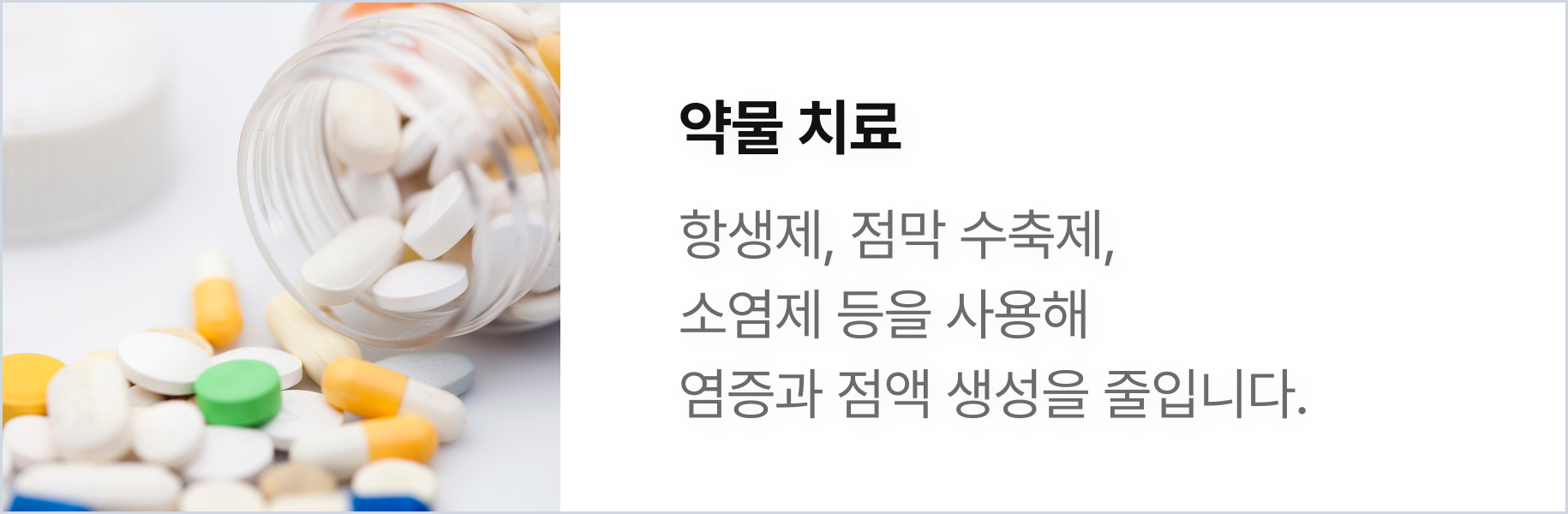 치료 방식 | 항생제, 보존적 치료 | 약물, 필요에 따라 수술적 치료 병행 |